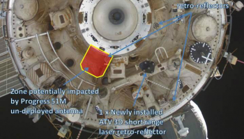 View of the docking port on the Zvezda module marking the area potentially impacted by Progress M-19M in April 2013 (Credits: Roscosmos/Anatoly... Read more →
