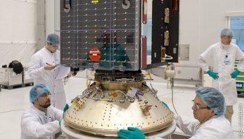 Proba-V ready to be integrated in the Vega’s upper stage. The launch will also include VNREDSat-1 and the ESTCube-1 satellites (Credits:... Read more →