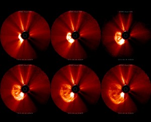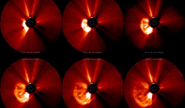 The flares were caught at a lucky angle by NASA’s STEREO A solar observation satellite. STEREO A is one of a pair of satellites view the Sun simultaneously from opposing orbits. This allows them to capture 3D views of the Sun and see the “back” side of the Sun never visible from Earth. This time, STEREO A was looking at the coronosphere from the side with respect to the solar flares, capturing head-on views of their CMEs.