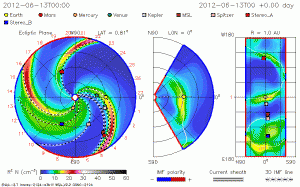The first flare occured on June 13 when Sunspot AR1504 produced an M1 class flare – a mid-level flare not likely to do serious damage to electrical or space assets. The same spot released a second M1 class flare on June 15. Although Earth is mostly protected by its magnetosphere, both Venus and Mars are expected to lose some of their unprotected atmospheres to the duo.