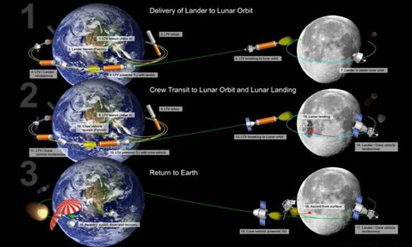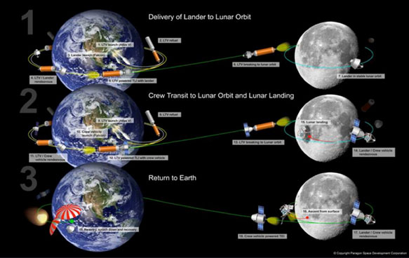 Golden Spike has not yet selected a launch vehicle and denied rumors that it was partnering with SpaceX to use the Falcon Heavy. The company plans to use existing vehicles or those already under development. It will use a two-step architecture, first launching an unmanned lander to lunar orbit, then sending a crewed vessel to rendezvous with the lander. Golden Spike will commision its own lander and space suits. The latter will no doubt fall under the purvue of Board of Advisors member Jonathan Clark, a former Space Shuttle flight surgeon who has recently been advancing pressure suit technology in his work with Felix Baumgartner‘s Red Bull Stratos mission.