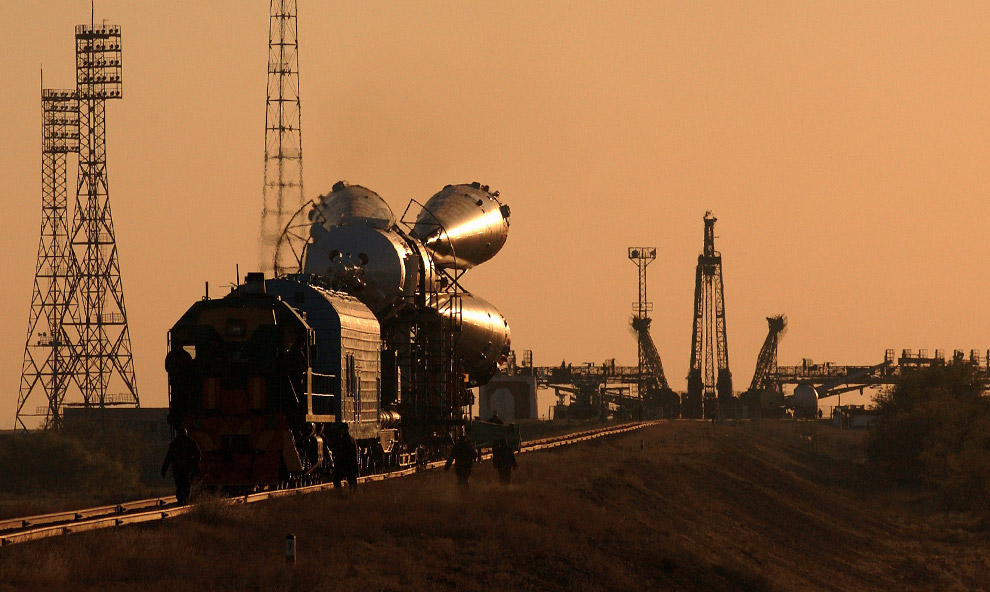 A Soyuz takes the train to the Baikonour launch pad (Credits: NASA).
