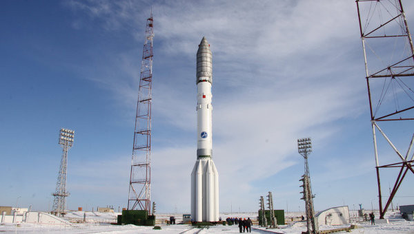 The Proton rocket prior to launching from the Baikonur Cosmodrome (Credits: RIA Novosti).