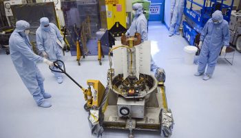 Technicians handle the Mars Science Laboratory's RTG at NASA Kennedy Space Center's Payload Hazardous Servicing Facility (Credits: NASA/Kim... Read more →