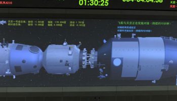 An animation of the Tiangong-1 module and Shenzhou-8 spacecraft as they dock is shown on a monitor at the mission's Beijing control center.... Read more →