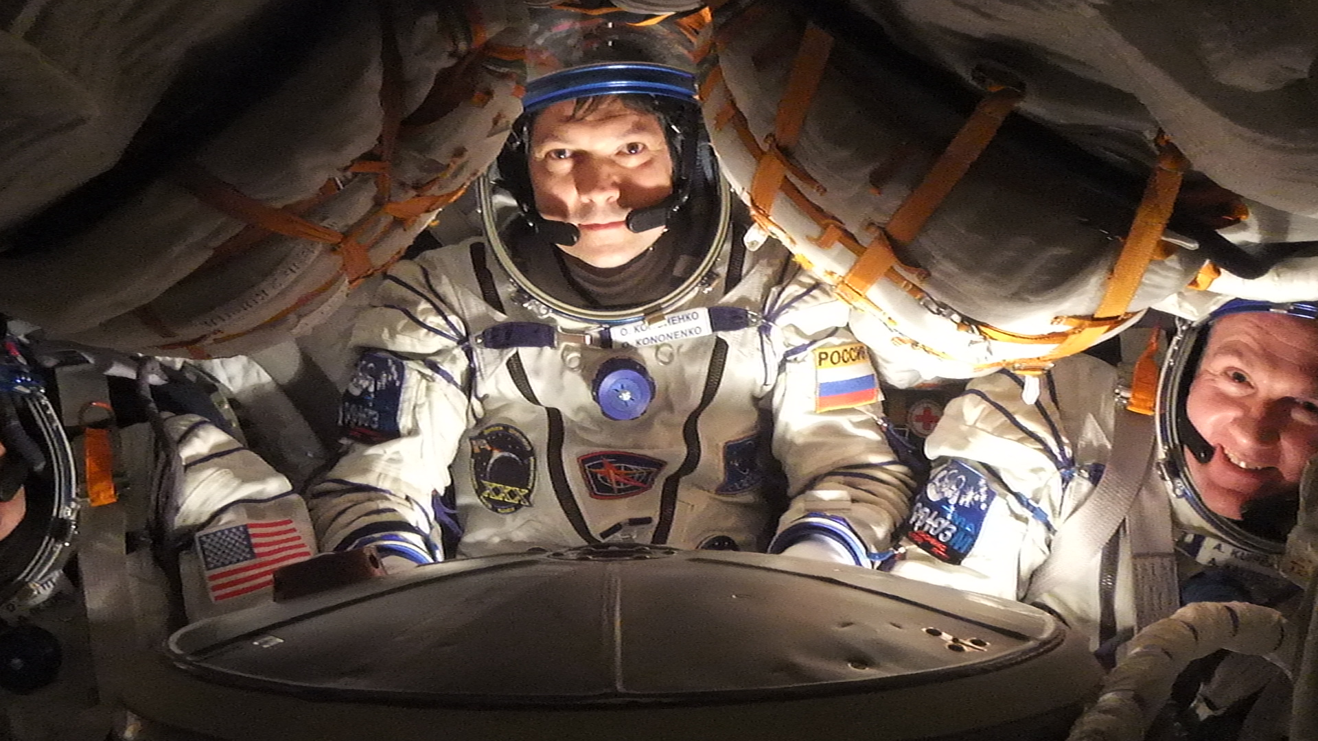The first fit check of Soyuz TMA-03M spacecraft, equipment and spacesuit on 9 December 2011. Oleg Kononenko is in the middle, André Kuipers on the right and Don Pettit on the left. (Credits: ESA).