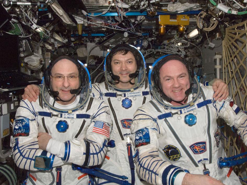 Russian cosmonaut Oleg Kononenko (center), Expedition 31 commander; along with NASA astronaut Don Pettit (left) and European Space Agency astronaut Andre Kuipers, both flight engineers, attired in Russian Sokol launch and entry suits, prepare for their July 1 departure (Credits: NASA).